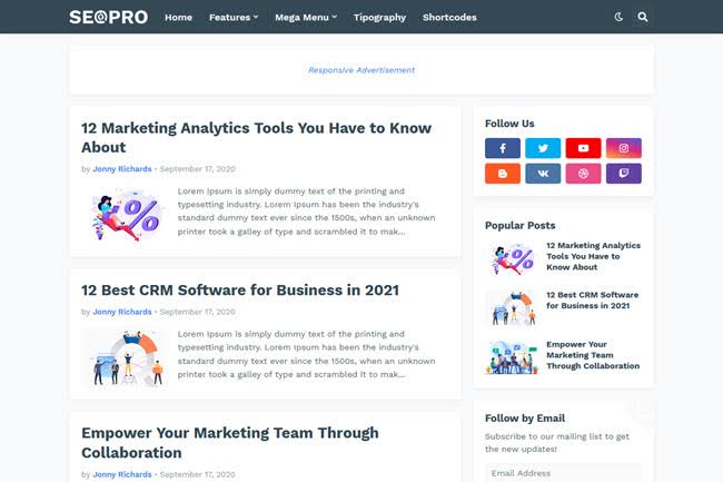 SeoPro v1.4 Premium Blogger Template Blogger Template makes it simple to interact with readers and expand your online presence with personalised widgets, mobile layouts that are optimised for small screens, and integrated social network sharing options. Additionally, you may make money while retaining a refined and attractive appearance thanks to its numerous ad spaces.